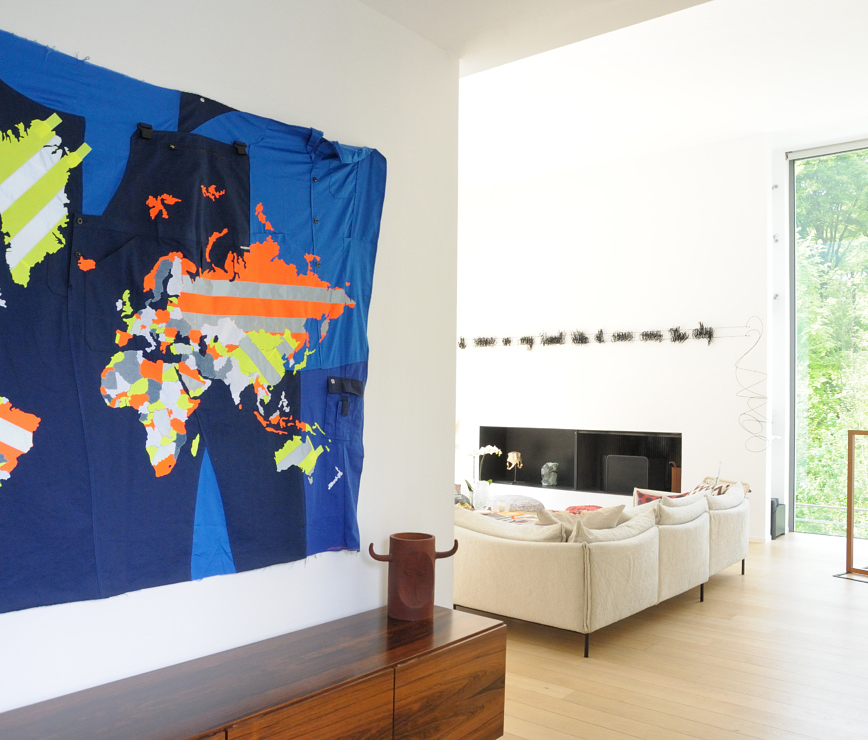 By integrating a private space, the works of the Textile Languages exhibition blend with the house’s modernist style. They seem to embody the ideas of German-born American artist Anni Albers (1899-1994), a teacher at the Bauhaus and one of the textile design pioneer figures: If architecture is rigid and permanent by nature, textile is its very opposite. The exhibition presents works by some fifteen artists from very diverse cultural backgrounds and generations, with a special interest in the Indian emerging scene. Art forms focused on intimacy, memory, repetition and collective experience merge with practices expressing more a politically versed critical vision of the world, encapsulated by the choice of textile as a creative medium. If a derivation from the revival of the neo-crafts trend – which incidentally questions the very notion of craftsman-ship – is to be considered, it is mainly the expressive potential of the medium, its ability to create a language and convey a message that is here put to the fore, beyond mere aesthetic criteria.