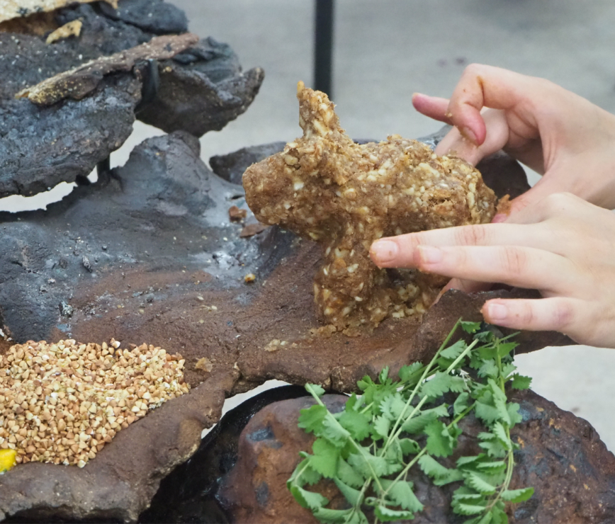 Tiphaine Calmettes se saisit d’une pratique artistique sur les sens et le sensible, en constante interaction avec le vivant. Diplômée des Beaux-Arts de Bourges, elle met en oeuvre des narrations comestibles prenant la forme de véritables expérimentations culinaires et performatives. De la terre nourricière au matériau, il n’y a qu’un pas. Tiphaine Calmettes sculpte la matière, la malaxe et la transforme en interrogeant les formes réversibles. Ne pas laisser de trace. De sa main nait des oeuvres évolutives dans le temps et dans l’espace qui, érigées du sol, les lui sont rendues une fois que leur valeur d’usage est passée. Ses oeuvres ont notamment été exposées à la Zoo Galerie de Nantes, au Kunstwerk Carslhütte en Allemagne, à l’Ecole Normale supérieure dans le cadre de la Biennale de Lyon en 2019 ou encore au Centre International d’art et de paysage de l’île de Vassivière. Lauréate du prix AWARE 2020 qui récompense chaque année une artiste femme émergente, Tiphaine Calmettes intègrera prochainement la collection du CNAP.